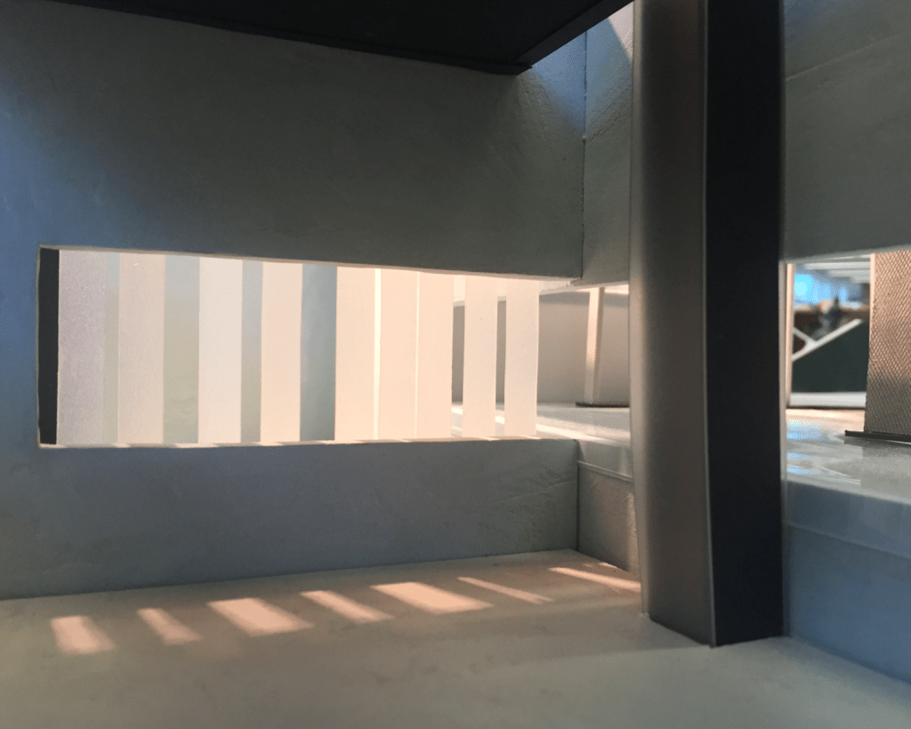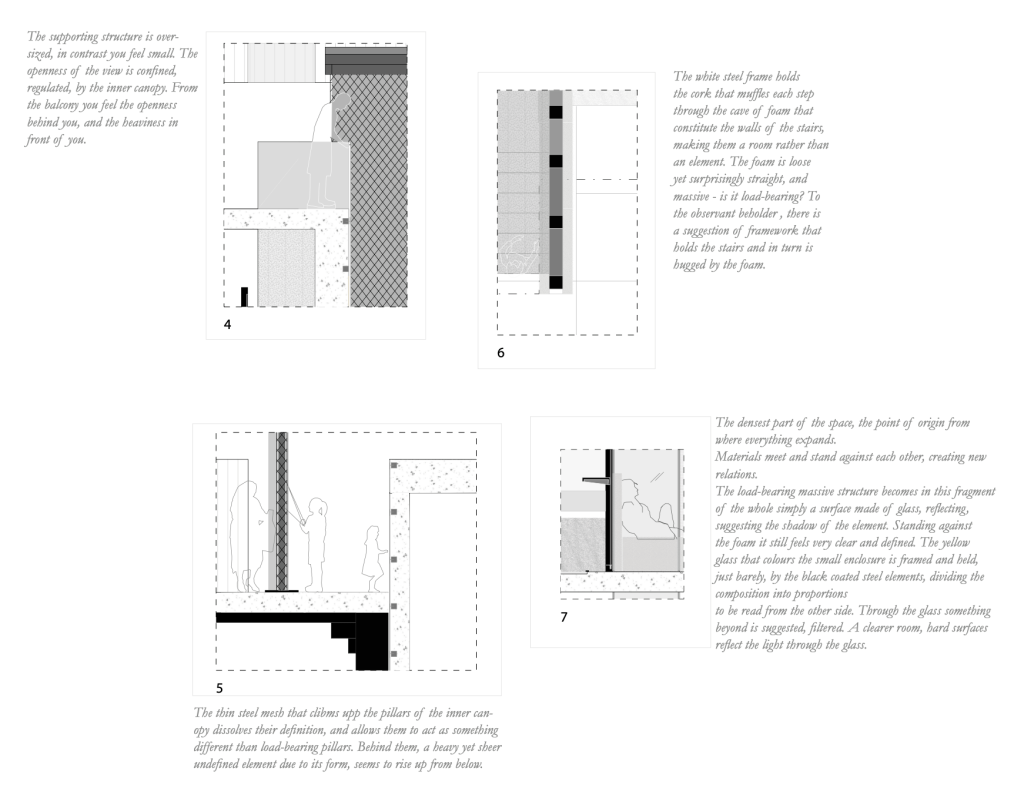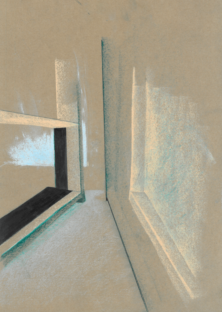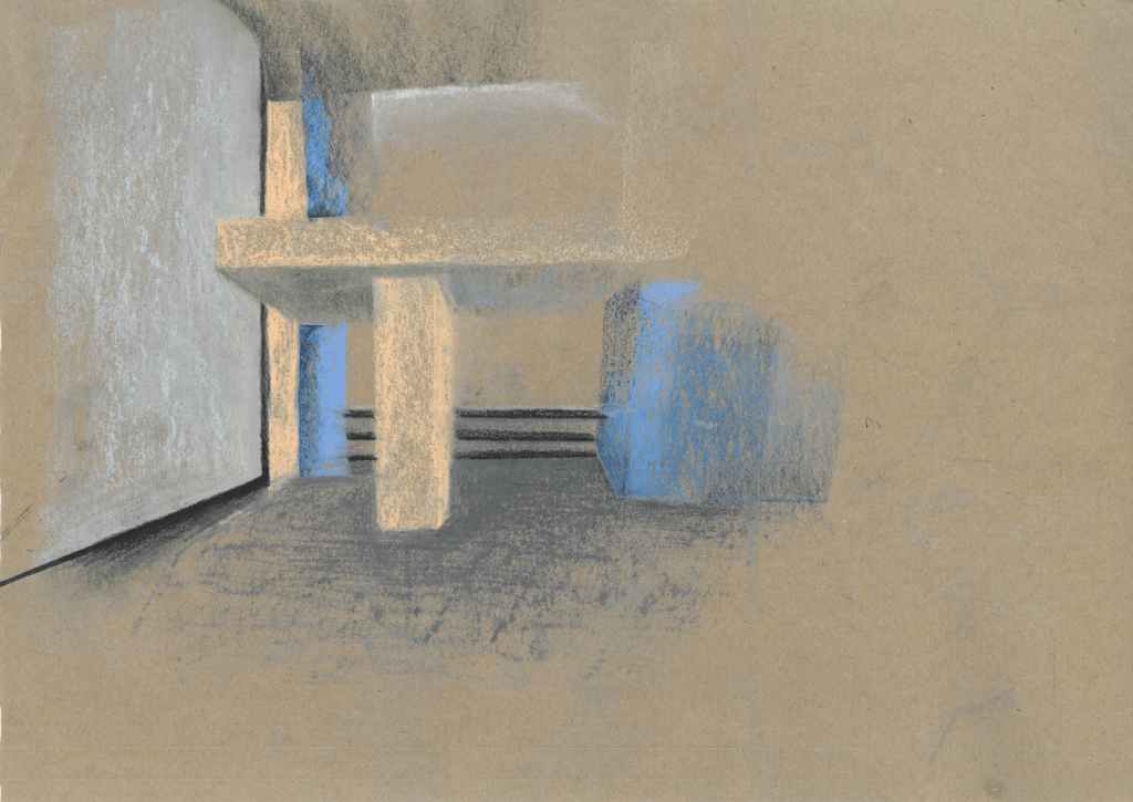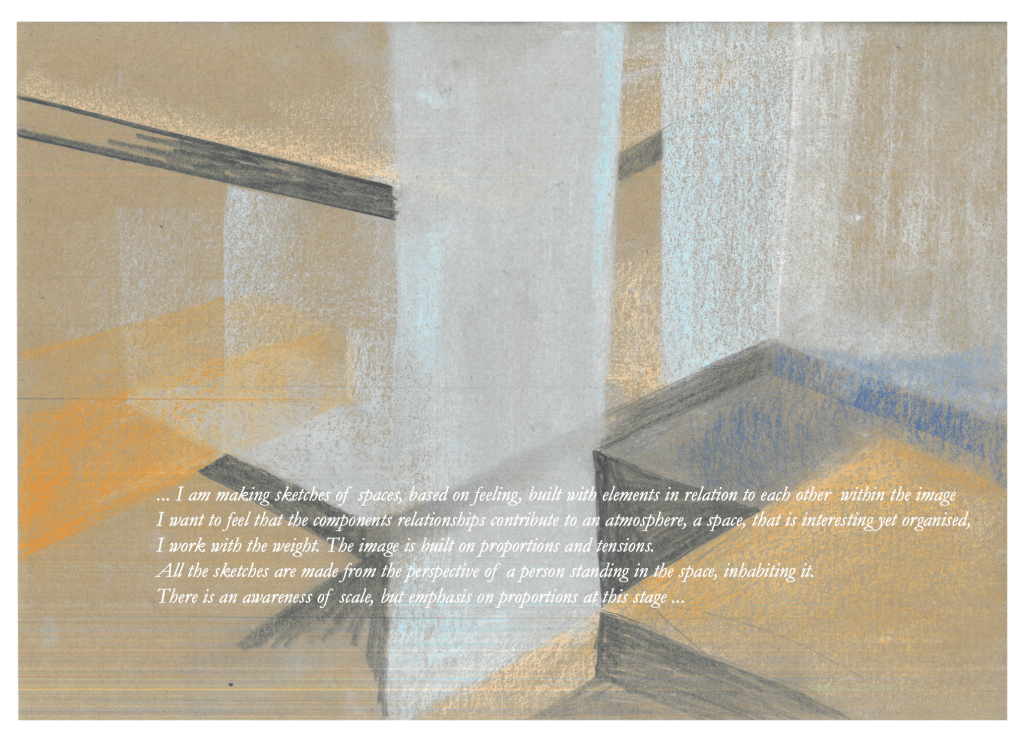 The method, based on a mash-up of theories about perception, consisted of interpreting a 2d-sketch into 2d drawings, and then translating these into models where materials were used to further de-code assumptions about how the spaces should be used. Detailed drawings were made based on questions the models posed.
